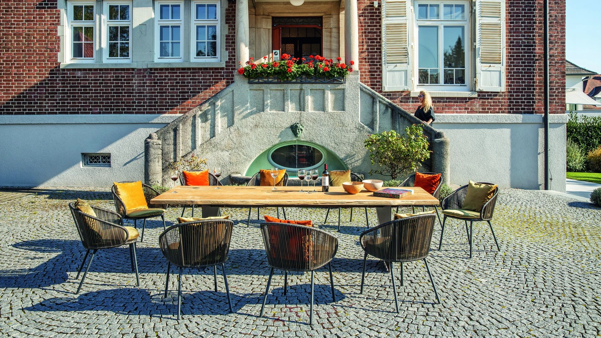 Das feine Geflecht in Dark Grey verleiht Filo seine ruhige, mediterrane Anmutung. Kombiniert wird es mit einem Gestell aus geschliffenem oder pulverbeschichtetem Edelstahl. So entsteht ein Möbelstück, das dem Außenbereich eine entspannte Eleganz verleiht und handwerkliche Präzision spürbar macht.