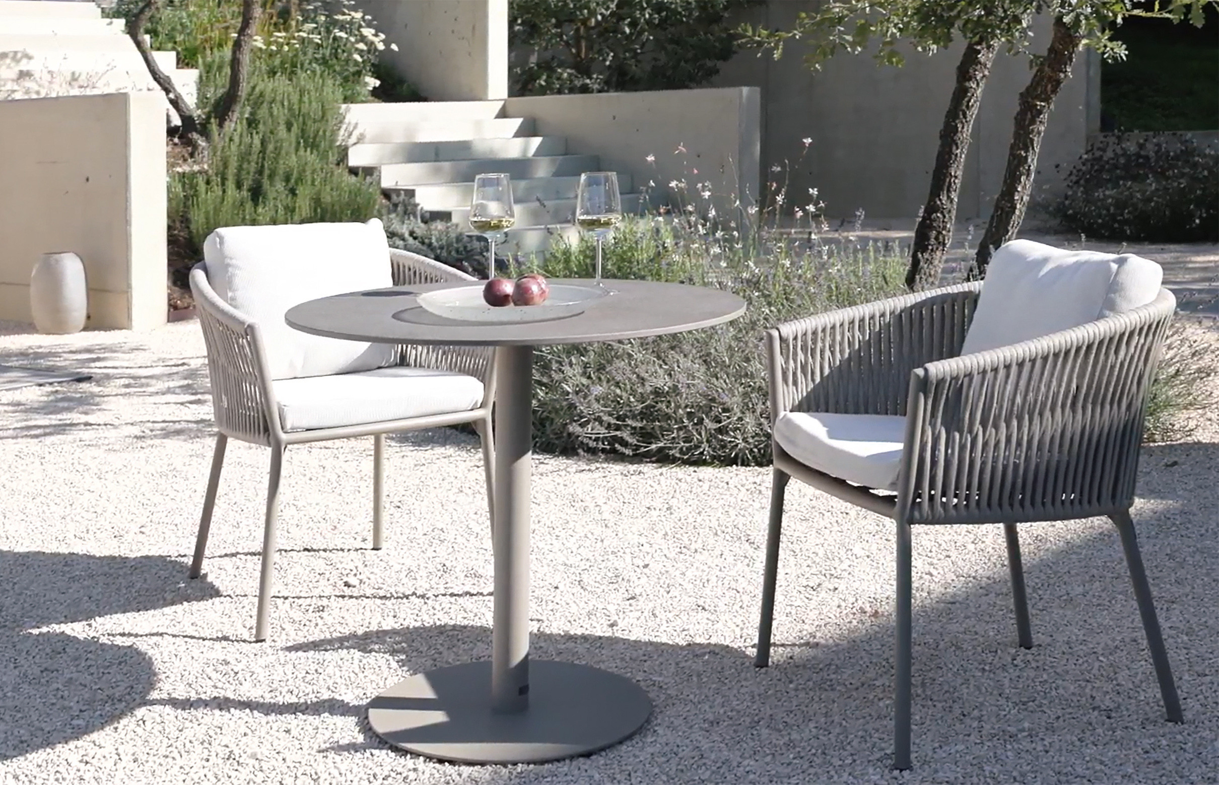 Die Cosmo Collection – eine elegante Kombination von einem weißen oder anthrazitfarbenem Aluminiumgestell und hochwertigem Bändern. Zusammen mit flauschigen Kissen entsteht so eine attraktive Outdoor-Kollektion in eleganter Gestaltung mit bestem Sitzkomfort. Neben preiswerten Standardkissen können elegante und individuelle Kissen aus einer Vielzahl von hochwertigen Outdoorstoffen ausgewählt werden. Die Kissen sind Dank der Füllung mit Quick-Dry-Foam schnell trocknend. Die weißen Gestelle werden mit hellgrauem fm-flat-rope angeboten. Die anthrazitfarbenen Gestelle mit fm-flat-rope anthrazit oder dem hellen fm-flat rope linen.
