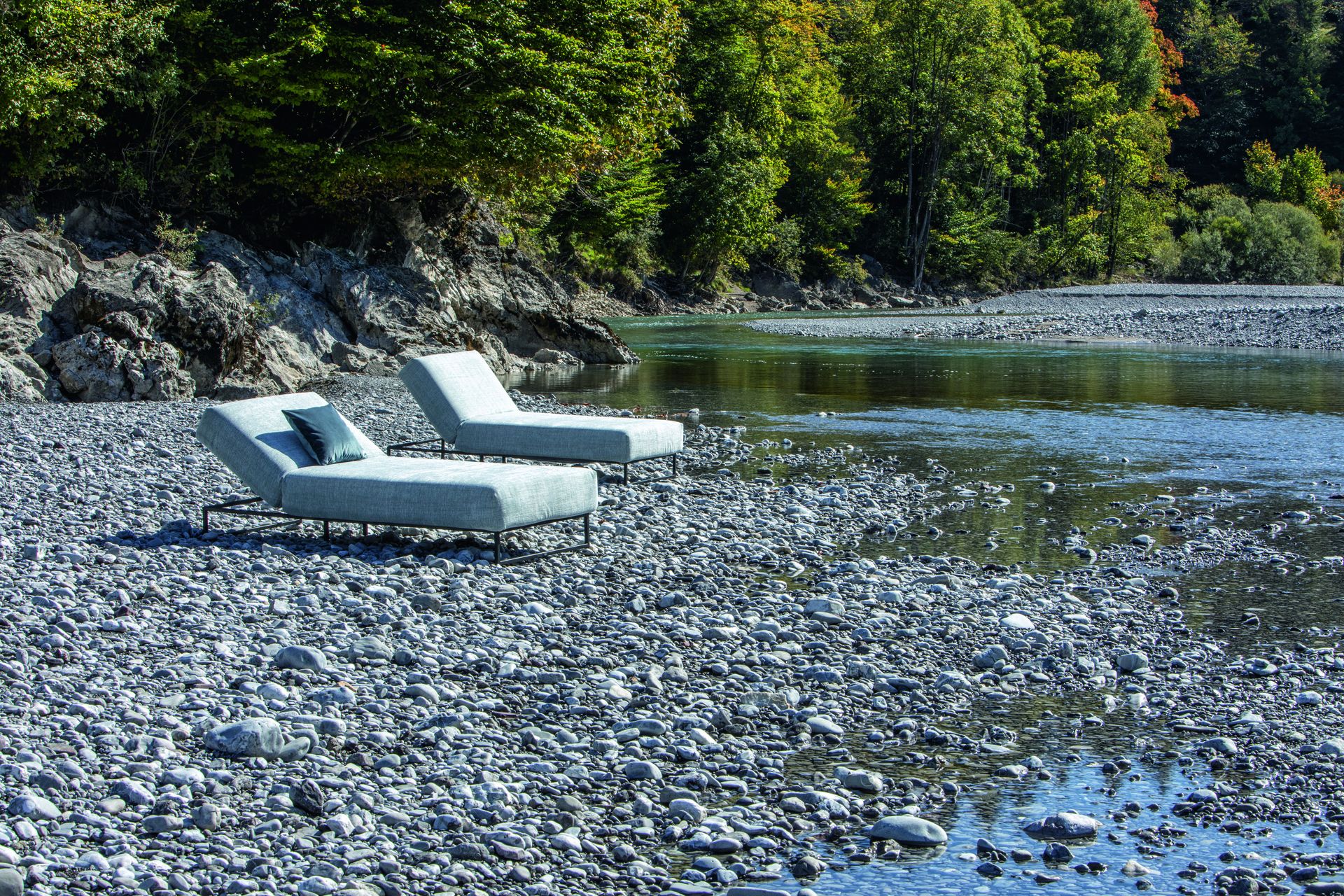 For moments of deeper relaxation, the Flora sun lounger offers exceptional comfort. Its generously padded surface and multi-adjustable headrest provide noticeable support and invite extended relaxation. Depending on preference, it is available in a purist version with glides or with an elegant raised frame.