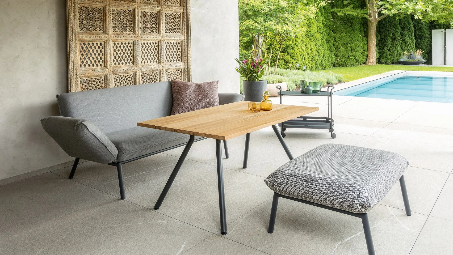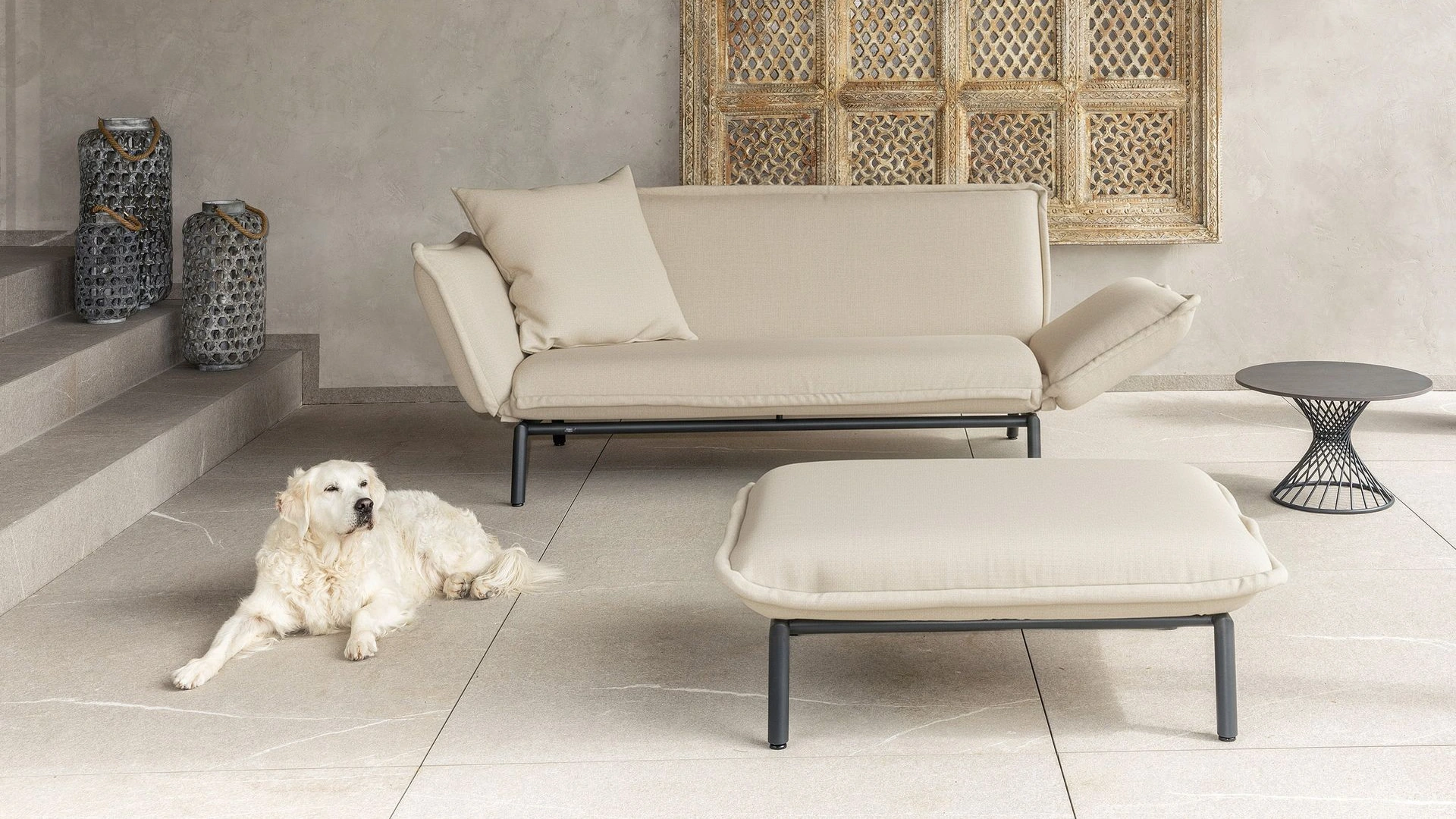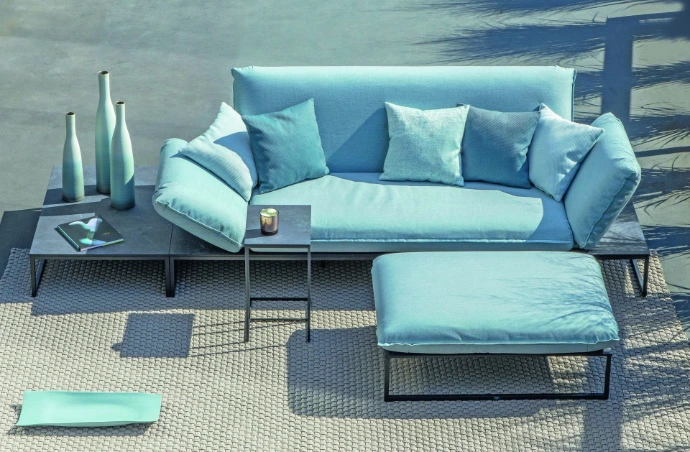 Passend dazu ergänzen ein abgestimmter Beistelltisch sowie eine Polsterbank die Lounge. Beide Elemente erweitern das Sofa funktional und erhöhen den Sitz- und Liegekomfort, ohne sich in den Vordergrund zu drängen.