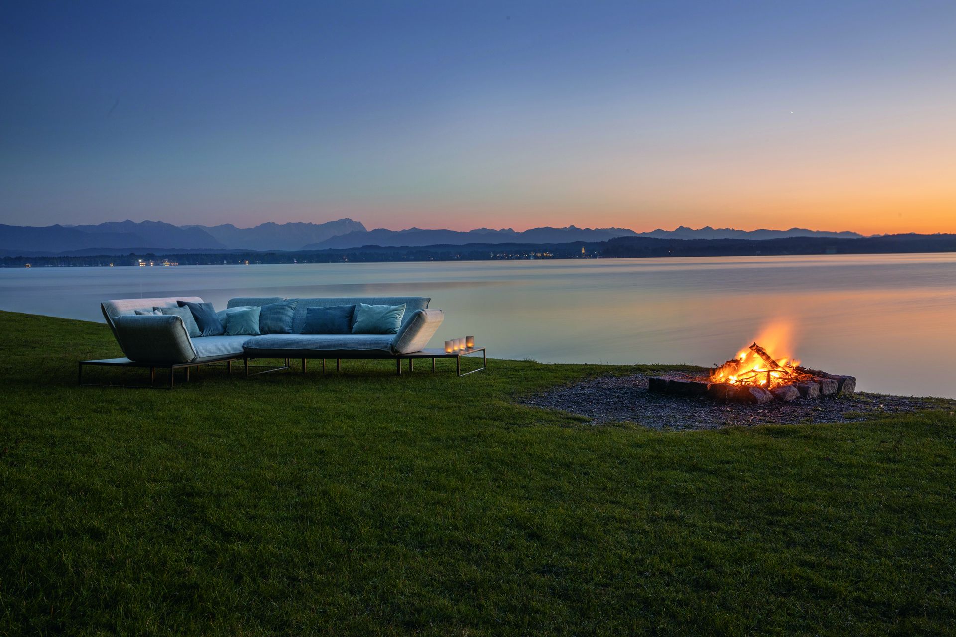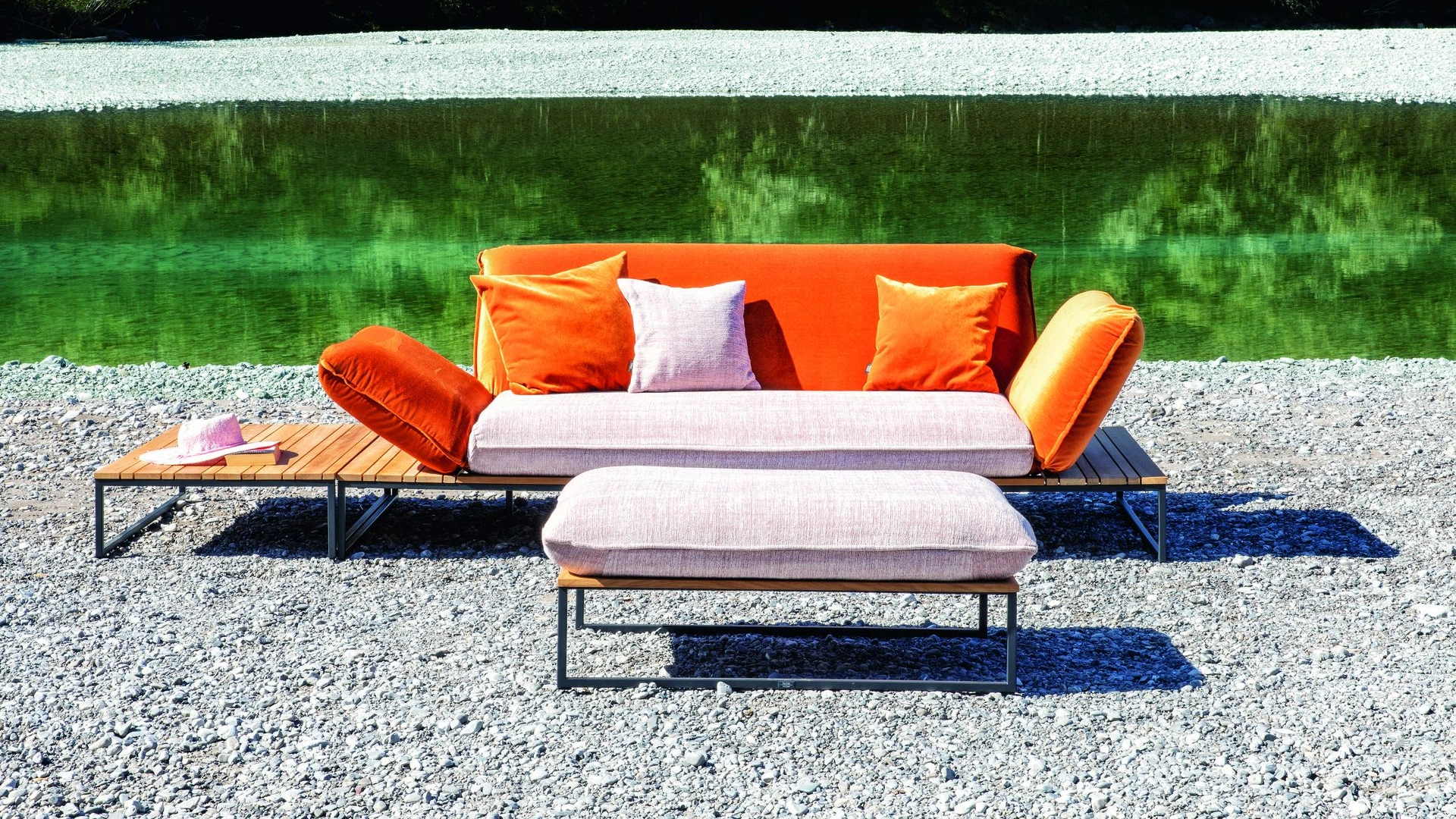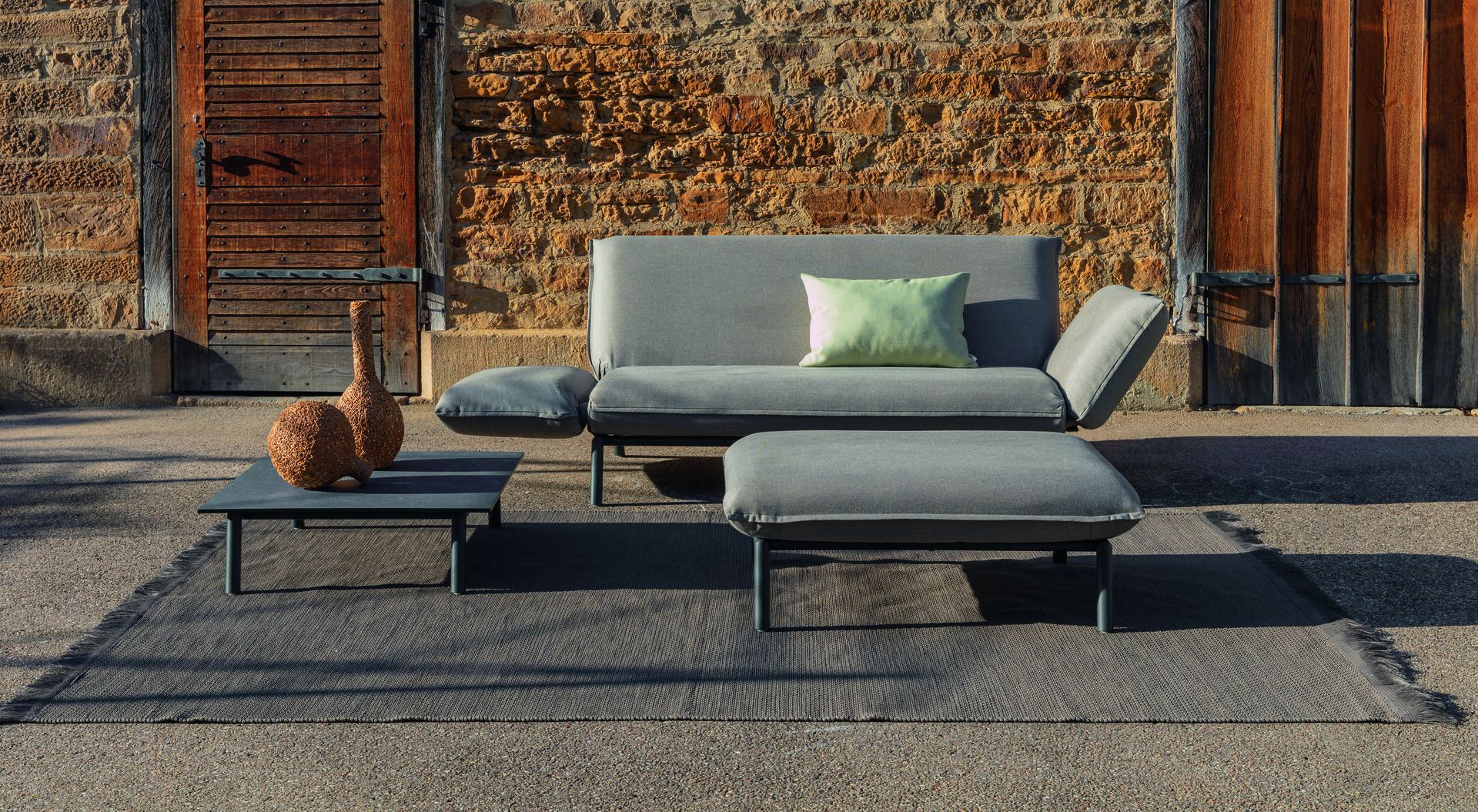 Passend dazu ergänzen ein abgestimmter Beistelltisch sowie eine Polsterbank die Lounge. Beide Elemente erweitern das Sofa funktional und erhöhen den Sitz- und Liegekomfort, ohne sich in den Vordergrund zu drängen.