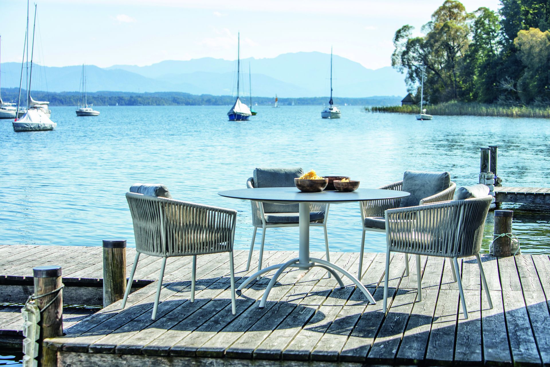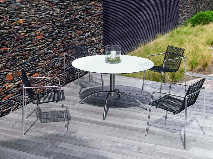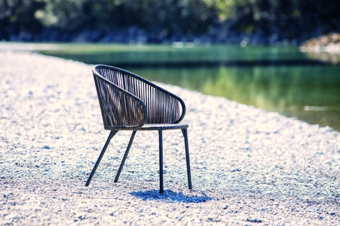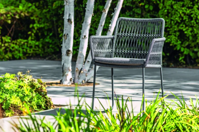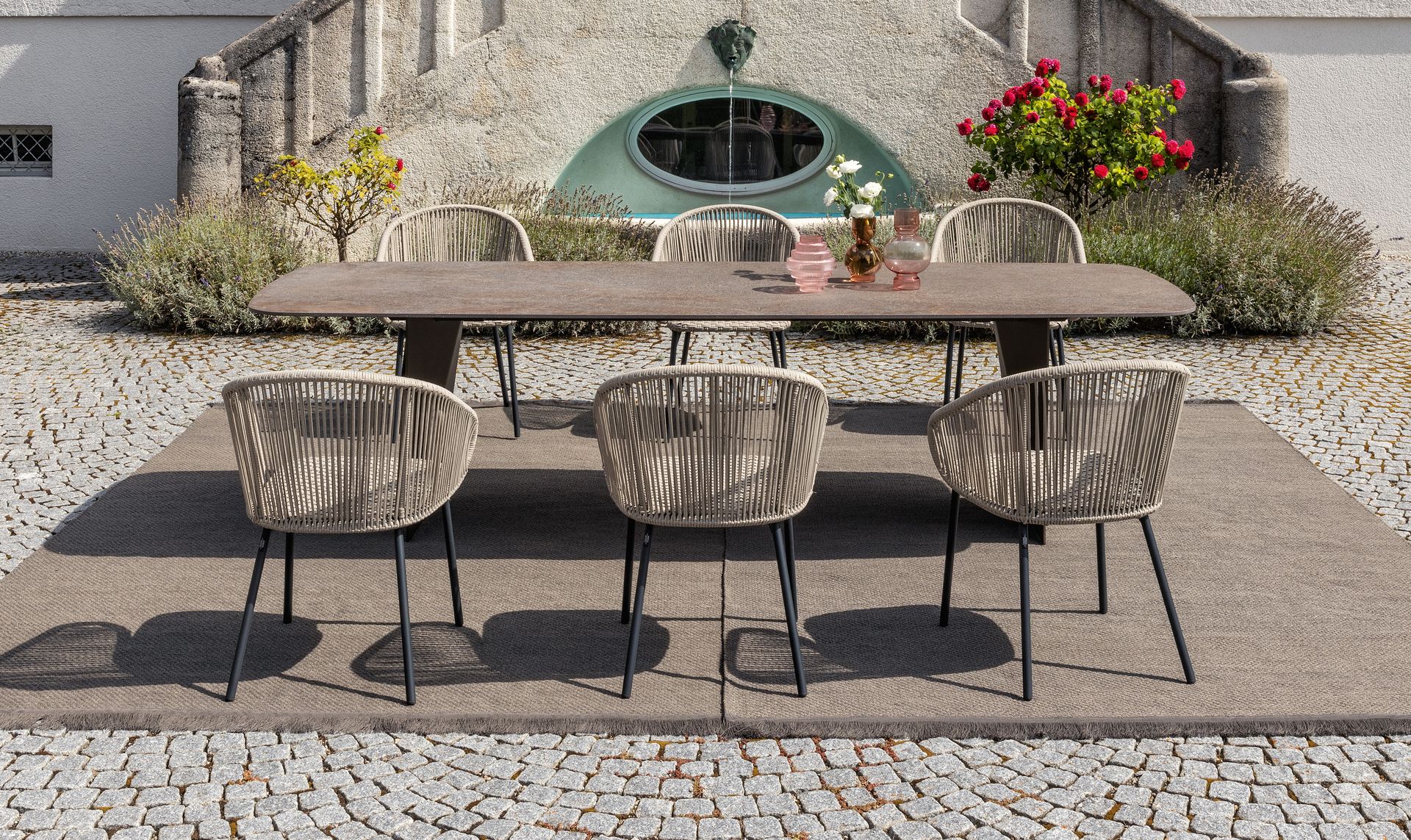 Das feine Geflecht in Dark Grey verleiht Filo seine ruhige, mediterrane Anmutung. Kombiniert wird es mit einem Gestell aus geschliffenem oder pulverbeschichtetem Edelstahl. So entsteht ein Möbelstück, das dem Außenbereich eine entspannte Eleganz verleiht und handwerkliche Präzision spürbar macht.