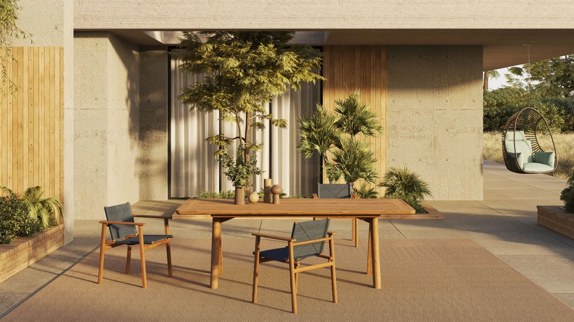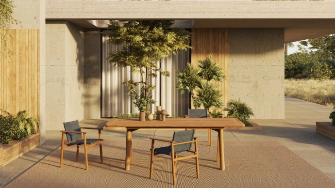 Seine nachhaltige Formgebung verleiht dem Sessel einen nahezu meditativen Charakter. Der Materialmix aus forstwirtschaftlich angebautem Teakholz und wetterfestem Textil wirkt einladend und natürlich zugleich. So fügt sich Tennis mühelos in unterschiedlichste Outdoor-Umgebungen ein – zurückhaltend im Ausdruck, klar in der Haltung und konsequent auf Langlebigkeit ausgelegt.