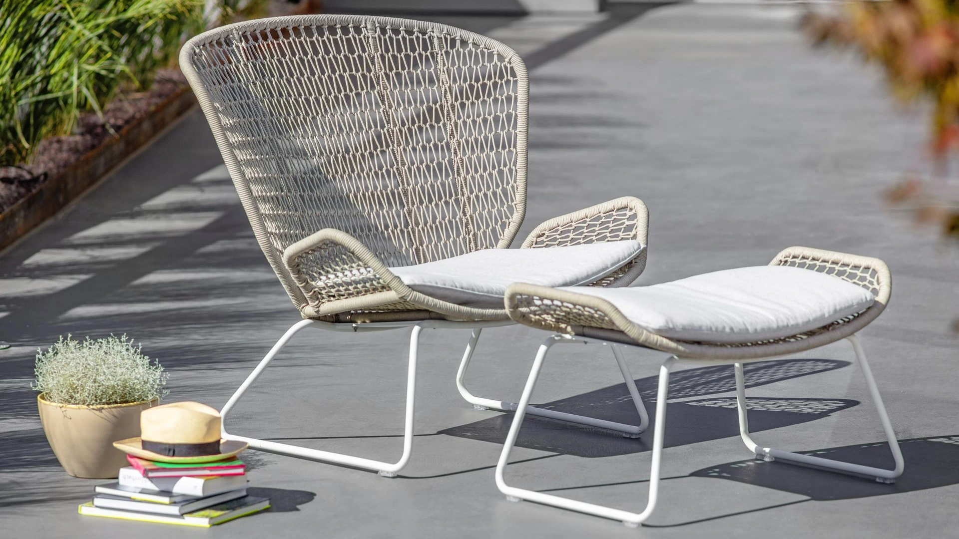 Charakteristisch für die Serie ist das offene, handwerklich gefertigte Flechtwerk, das Leichtigkeit mit Komfort verbindet. Relax-Sessel, Sofa und Hocker setzen dezente Akzente und definieren den Outdoorbereich als persönliche Ruhezone. Die Auswahl an Schnüren in Hellgrau, Anthrazit oder jasmin sowie Gestelle aus Teakholz oder Aluminium in Weiß oder Anthrazit ermöglicht eine präzise Abstimmung auf Architektur und Umfeld. So entsteht eine moderne Relaxserie mit klarer Haltung und hoher Aufenthaltsqualität.